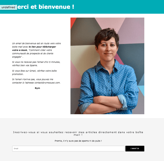Cette page lui indique comment accéder à l’offre demandée (par email ou alors en téléchargeant direct). Elle est importante car elle permet d'envoyer vers d’autres landing pages ou de partager des informations utiles.